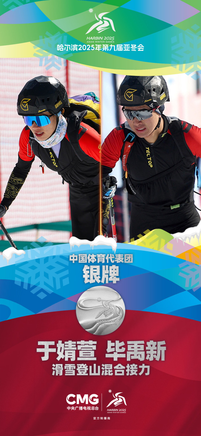 Pada 12 Februari, Harbin Asian Winter Games Ski Mountaineering Final Relay, pasukan Cina memenangi pingat emas, perak dan gangsa. Gabungan Cidan Yuzhen/Bruer memenangi pingat emas, Yu Jingxuan/Bi Yuxin memenangi pingat perak, dan Solang Quzhen/Liu Jianbin memenangi pingat gangsa.