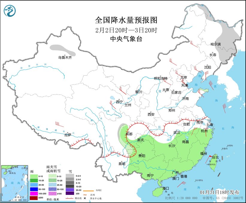 31 Ocak - 2 Şubat gecesi, güney bölgesinde çok çeşitli yağmur ve kar havası olacak. Gansu, güney Shaanxi, Orta ve Güney Henan, kuzeybatı Hubei, vb. Hafif ila orta kar veya karla kar yağışı olacak ve Shaanxi, kuzeybatı Hubei, güneybatı Henan ve Central Gansu'daki Qinling dağları gibi bazı bölgelerde ağır kar yağacak. Yukarıdaki alanlardaki kar birikimi derinliği 1 ila 3 cm idi ve lokal alan 5 cm'den fazlaydı. Güney'in çoğu yerinde ışık ila orta derecede yağmurlar görülür.