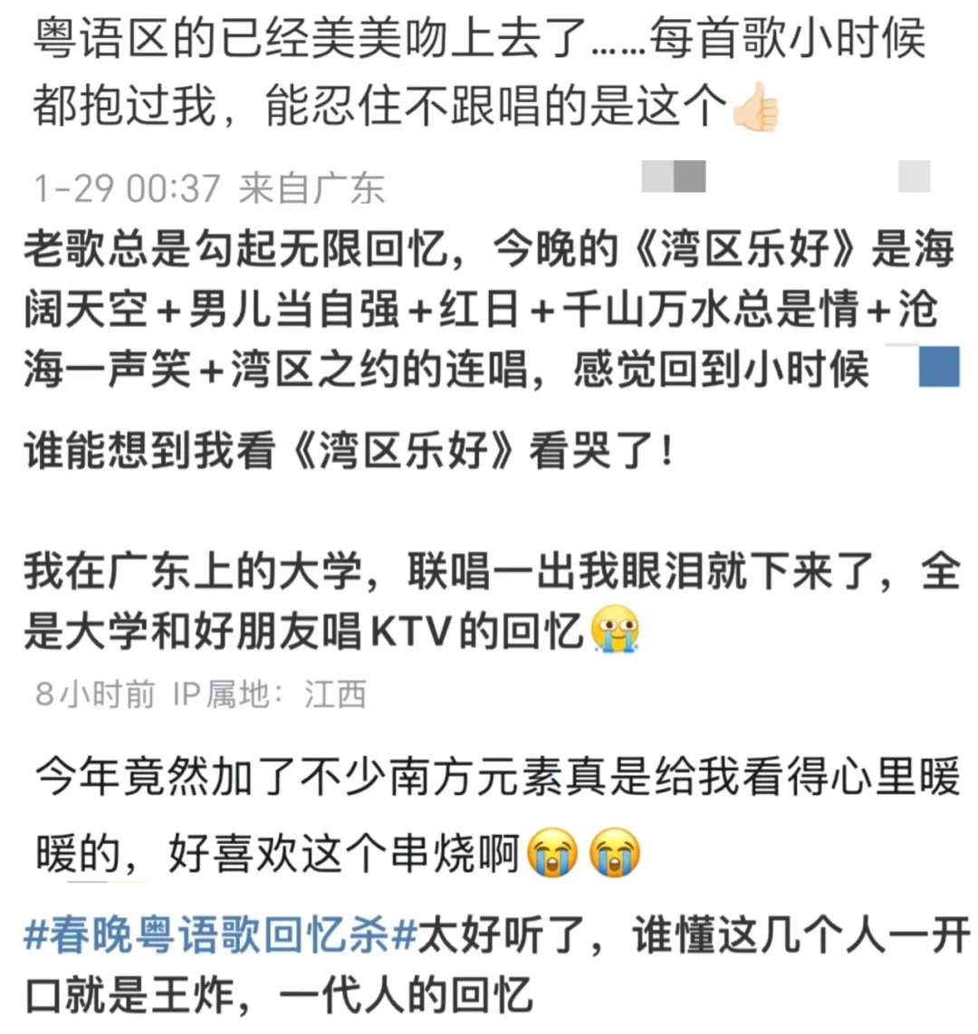 湾区金曲串烧,耳朵亮了!节目《湾区乐好》串烧《红日》《海阔天空》《男儿当自强》《万水千山总是情》《沧海一声笑》等经典粤歌,这些刻在广东人基因里的旋律,唤起了多少人的光辉岁月青春回忆。汪明荃、陈小春、张智霖等湾区面孔更让观众惊喜,“春晚下了大功夫,原汁原味唱粤语歌,开口即王炸”。