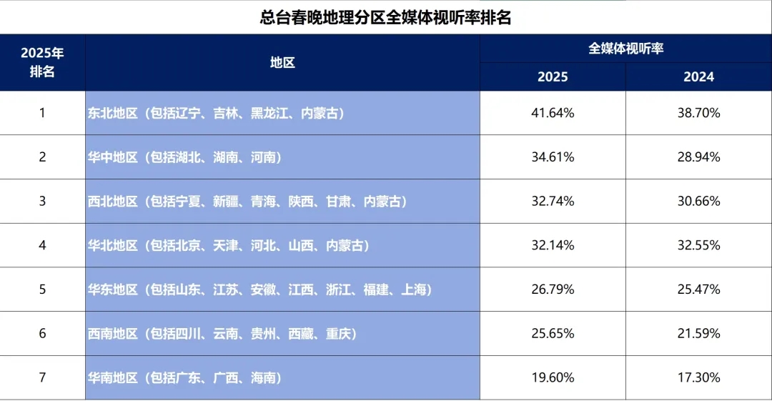 春晚华中地区的平均全媒体视听率达34.61%,比去年增加5.67个百分点;西南地区的全媒体视听率达25.65%,比去年增加4.06个百分点;华南地区的全媒体视听率达到19.6%,比去年增加2.3个百分点。