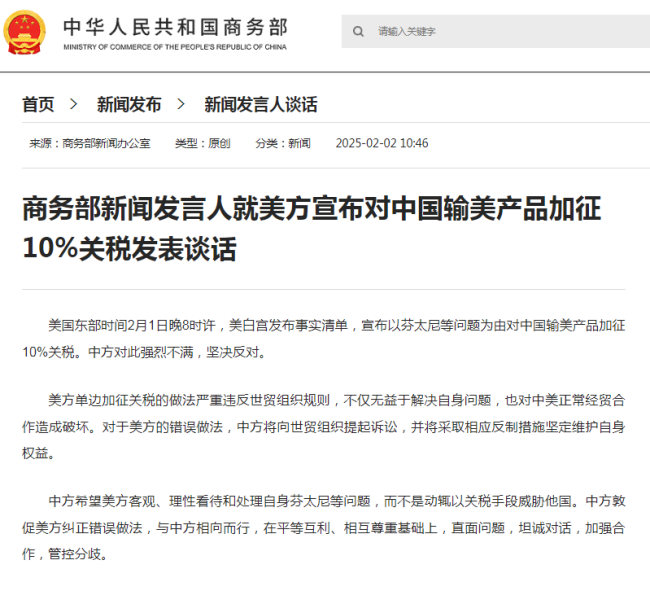 1 Şubat'ta doğu saatinde Beyaz Saray, Fentanil ve diğer konular nedeniyle ABD'ye ithal edilen Çin ürünleri için% 10 daha fazla tarife ilan eden bir gerçek listesi yayınladı. Çin bundan çok memnun değil ve buna sıkı sıkıya karşı.