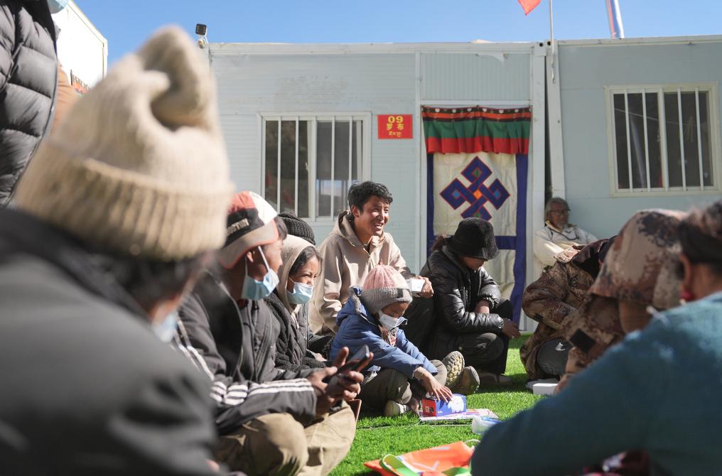 古荣村村委会主任桑杰(中)在安置点和群众闲聊。新华社记者 晋美多吉 摄
