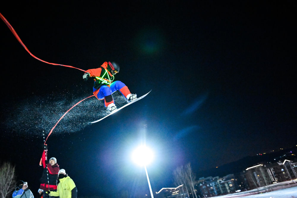 滑雪爱好者在进行滑雪趣味跳高赛 颜麟蕴 摄