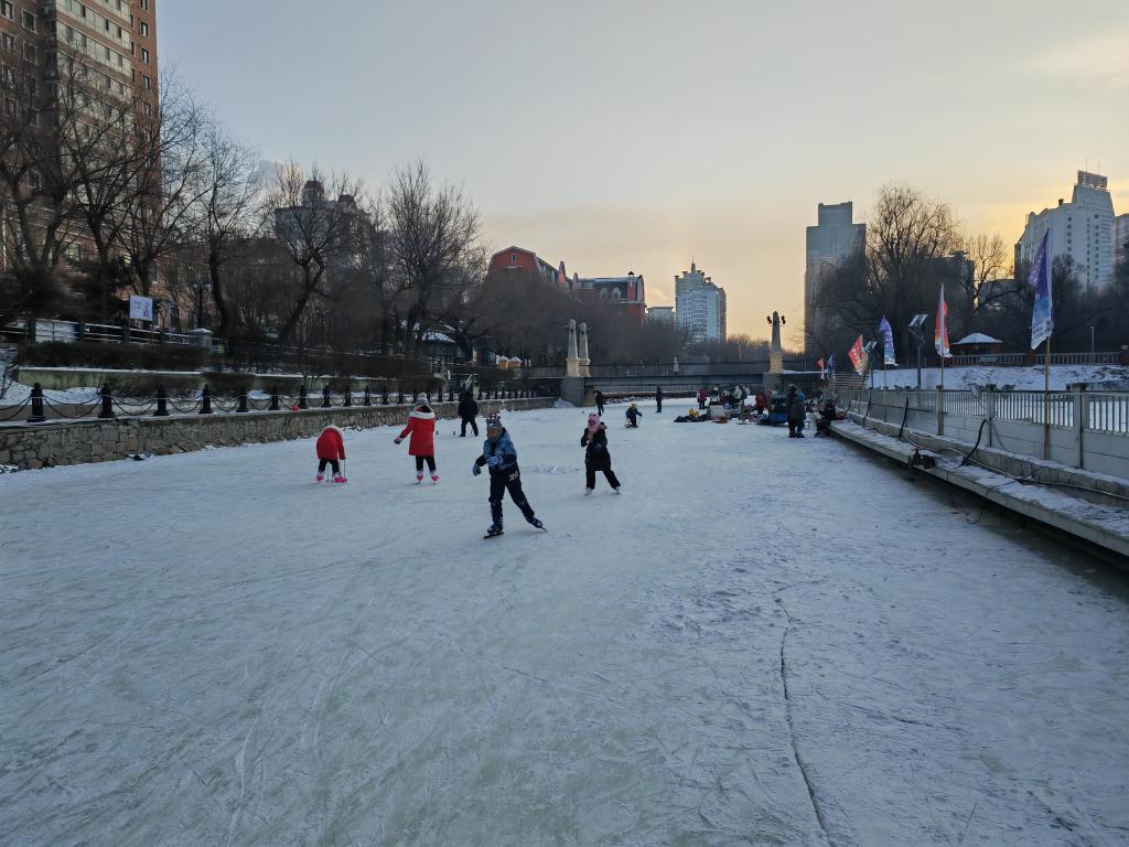 除了大名鼎鼎的松花江,哈尔滨老城区有条小河穿城而过,名叫马家沟。沿着这条河走一段,你可能会发现这里冰雪运动如此蓬勃发展的秘密。河面上大片大片的雪被清扫掉,露出长宽几十米的平整冰面。而附近的孩子大人,拎着冰鞋和小马扎下到河面,坐在小马扎上把鞋一换,就在这里滑冰,一滑就是半天。