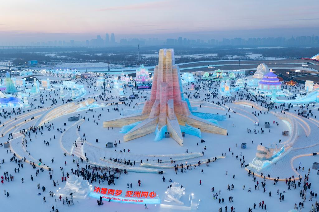 1月5日,在哈尔滨冰雪大世界园区,游客在主塔“亚洲同心”附近游玩(无人机照片)。新华社记者 谢剑飞 摄