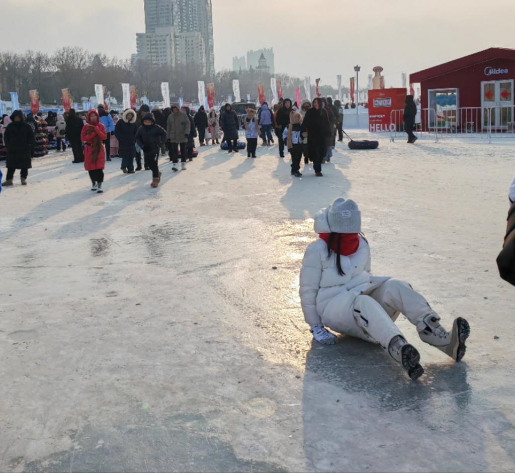 不过,无论哪种表现,他们与冰面大面积接触的概率都差不多,只不过前者趴在冰上,后者往往摔得四仰八叉,结果引来的都是一串“hhhh”的爆笑。全副武装的游客也不会摔疼,给周围路人带来的欢乐却是实打实的。游客第一次摔,往往站起来拍拍屁股,挤出一些羞涩的笑;两次三次过后,那就轻车熟路了,嘴角往往比人还先站起来。