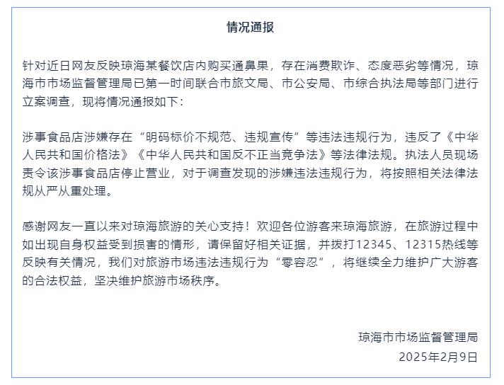 CCTV Haberleri: "Canlı Hainan" ın WeChat resmi hesabına göre, 9 Şubat'ta, Qionghai Belediye Piyasası Denetimi ve İdare Bürosu, netizenlerin Qionghai'deki bir restoranda tunbill meyve satın alımının son raporlarına yanıt olarak, qionghai pazarının yüklenmesi için kötü bir tahliye ve kötü dava açtığı bir durum raporu yayınladı. Belediye Turizm ve Kültür Bürosu, Belediye Kamu Güvenliği Bürosu, Belediye Kapsamlı Kolluk Bürosu ve diğer departmanlar. İlgili gıda mağazası, "Standartsız Fiyatlandırma ve Yasadışı Tanıtım" gibi yasadışı ve düzensiz davranışlardan şüpheleniliyor ve "Çin Halk Cumhuriyeti'nin fiyat yasası" ve "Çin Halk Cumhuriyeti'nin yarışma yasası yasası" nı ihlal ediyor. Kolluk kuvvetleri, ilgili gıda mağazasına yerinde çalışmayı bırakmasını emretti. Soruşturmada bulunan şüpheli yasadışı ve düzensiz eylemler, ilgili yasa ve düzenlemelere uygun olarak kesinlikle ve ciddi bir şekilde ele alınacaktır.