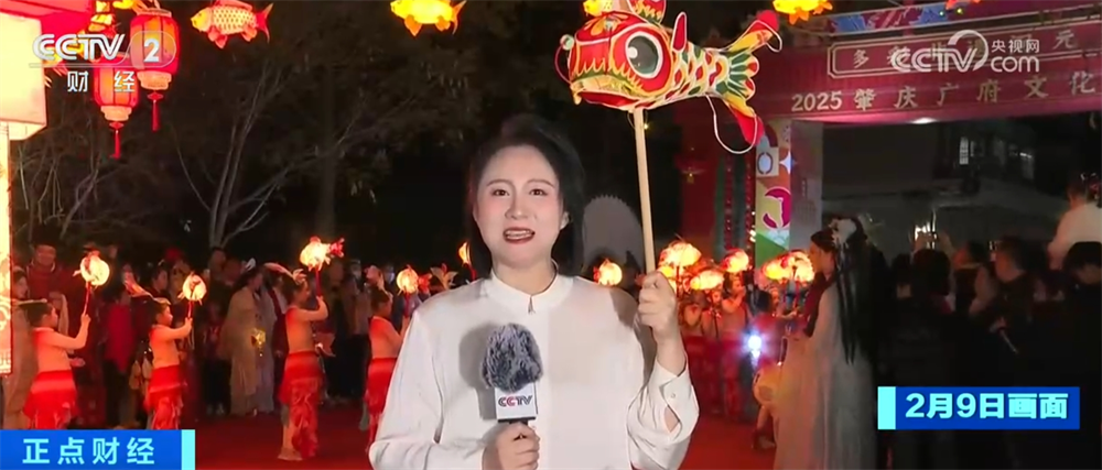 Zhaoqing yer adının anlamı şenlikli ve hayırlıdır. Buradan, fener sergisinin çok canlı olduğunu görebilirsiniz. Muhabirin ellerindeki balık fenerleri, bahar festivalinde birçok bölgede olması gereken bir tatil fenerleridir, bu da her yıl fazla anlamına gelir. Muhabirin arkasında, 18 çocuk çok şenlikli olan nimetler göndermek için ellerinde sazan fenerleri ile dans ediyor.