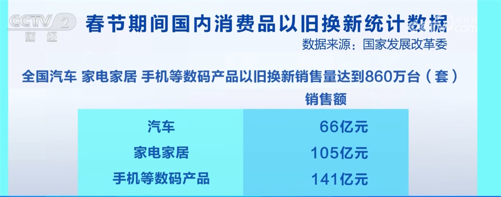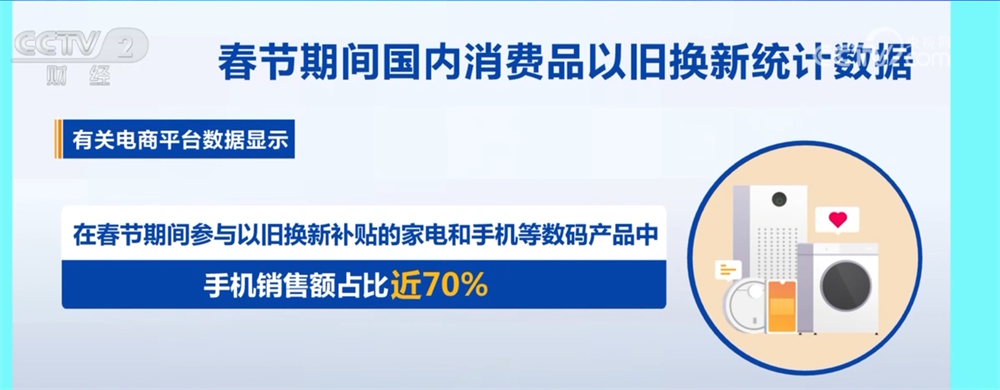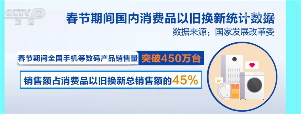 cep telefonları gibi dijital ürünlerin tüketimi bir "Yeni Yıl mal trendinin" oluşumuna yol açar. Ön incelemeye göre, bahar festivali sırasında, ülke çapında cep telefonlarının ve diğer dijital ürünlerin satış hacmi 4,5 milyon birimi aştı ve yeni ürünler için tüketim mallarının toplam satışlarının% 45'ini oluşturdu. E-ticaret platformundan elde edilen veriler, Bahar Festivali sırasında değişim gelir sübvansiyonuna katılan ev aletleri ve cep telefonları gibi dijital ürünler arasında cep telefonu satışlarının yaklaşık%70'ini oluşturduğunu göstermektedir.