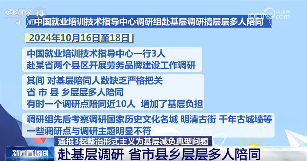 Çin İstihdam Eğitimi Teknik Rehber Merkezi'nin araştırma ekibi soruşturma için tabanlara gitti ve her seviyede birden fazla kişi eşliğinde. 16-18 Ekim 2024 tarihleri arasında, Çin İstihdam Eğitimi Teknik Rehberlik Merkezi'nden üç kişiden oluşan bir grup, İşgücü markasının inşası hakkında araştırma yapmak için belirli bir ilin iki ilçesine ve bölgesine gitti. Bu dönemde, tabanlara eşlik eden insan sayısı üzerinde sıkı bir kontrol eksikliği vardı. Her düzeyde illere, şehirlere, ilçelere ve ilçelere eşlik eden birçok insan vardı. Bazen bir araştırma sitesi, tabandaki yükü artıran yaklaşık 10 kişiye eşlik etti. Araştırma ekibi, ulusal tarihsel ve kültürel şehirleri, Ming ve Qing hanedanlarının eski sokaklarını, bin yaşındaki antik şehir duvarlarını vb. Araştırdı ve araştırdı. Bazı araştırma noktaları araştırma konusuyla açıkça tutarsız.