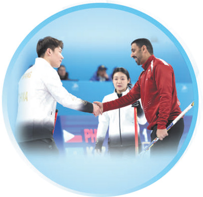 2月6日,中国队选手王智宇(左)和卡塔尔队选手在冰壶混双循环赛B组第八轮比赛后握手致意。新华社记者 王楷焱摄