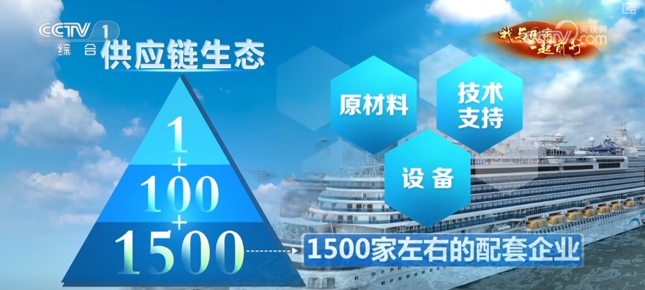 “卡脖子”的难关,除了技术还有供应链。关于大邮轮供应链生态,有一个“1+100+1500”公式:1指1家总装厂,100指的是约100家分包商,共同为这艘船工作。它们背后,还分布着1500家左右的配套企业,提供各种原材料、设备、技术支持。