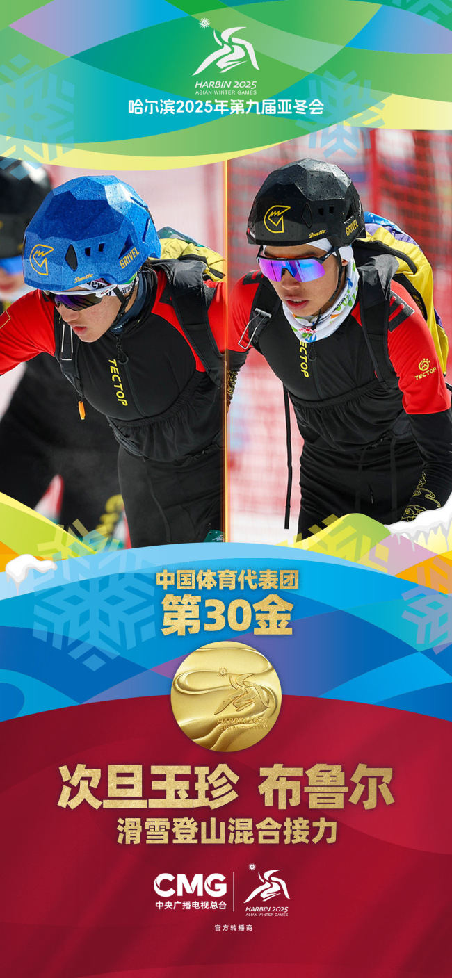 12 Şubat'ta Harbin Asya Kış Oyunları Kayak Dağcılığı Karışık Röle Finali, Çin takımı altın, gümüş ve bronz madalya kazandı. Cidan Yuzhen/Bruer kombinasyonu altın madalya kazandı, Yu Jingxuan/Bi Yuxin gümüş madalya kazandı ve Solang Quzhen/Liu Jianbin bronz madalya kazandı.