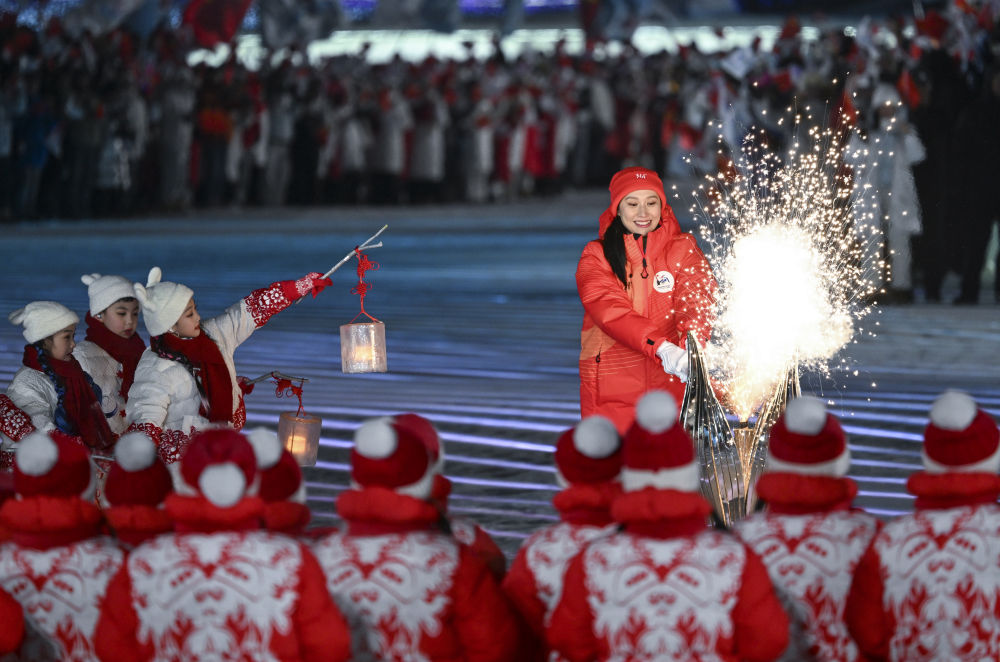 2月7日,第九届亚洲冬季运动会开幕式在哈尔滨举行。图为第四棒火炬手张虹点燃主火炬。新华社记者 李一博 摄