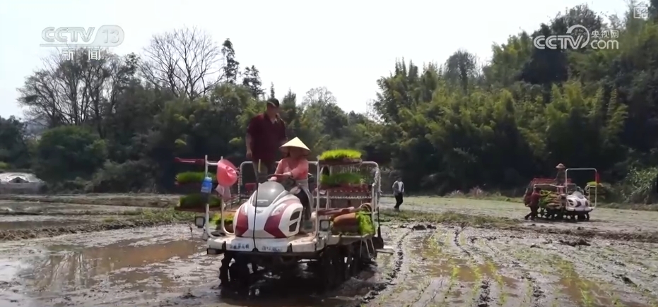 在赣州定南县岿美山镇的农田里,旋耕机和插秧机交替作业。旋耕机翻耕平整过的土地,插秧机再经过之后,秧苗就整齐地栽插到田里。在不远处的边角地块里,农户们正在手工插秧。