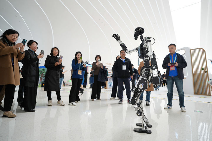 在中关村国际创新中心,一款名为“小关”的人形机器人向与会嘉宾招手(3月27日摄)。新华社记者 鞠焕宗 摄