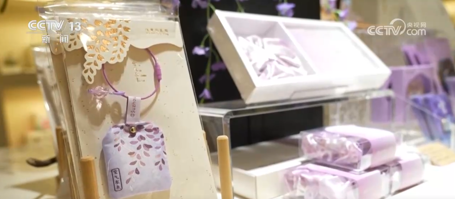 在苏州博物馆的庭院内,紫藤花优雅地垂挂在廊檐上,一串串花穗簇拥着,把风雅都酿在了这一庭春色里。在馆内的文创商店,这温柔的紫色也被用各种方式巧妙地“留住”。紫藤花图案的香囊、紫藤种子手工皂,还有信笺和印章印泥,各种紫藤花的巧妙组合成为了春日里的热销文创产品。