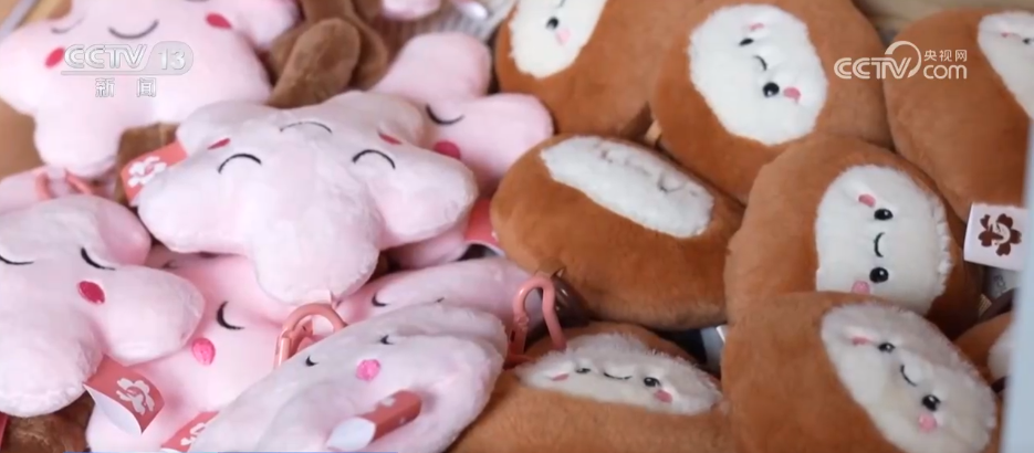 冰箱贴是年轻人的“到此一游”,文创小玩偶此刻也静静躺在货架上等着它的主人。这几样小玩偶被称为“钟溪樱味三油萌宝”,是根据当地特色美食而设计的。三油,即油卷、油墩、油豆腐,樱味的原型就是春日限定的樱花糕了。这些软乎乎的文创玩偶将美食的味道“绒”化,逛完景区的游客当然是照单全收啦。