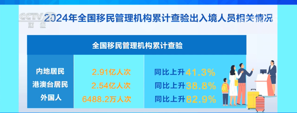 2024 yılında, ülkeye giren ve ayrılan toplam 610 milyon insan denetlendi, bu da yıllık% 43.9'luk bir artış 14 Ocak'ta devlet göçmenlik yönetimi tarafından düzenlenen bir basın toplantısından öğrendi. verilerinin 2024'te ulusal göçmenlik ajansından ilham alması, 29. 254 milyon Hong Kong, Macao ve Tayvan sakinleri ve 64.882 milyon yabancı, sırasıyla% 41.3,% 38.8 ve% 82,9 artışla. Yıl boyunca toplam 32.566 milyon gelen ve giden ulaşım aracı denetlendi ve bu da yıllık% 38.8'lik bir artış. Bunlar arasında 879.000 uçak, 101.000 tren, 437.000 gemi ve 31.149 milyon motorlu taşıt vardı, sırasıyla%62.6,%11,%8.2 ve%38.9 artışla. alakalı kişi, devletin ima İdaresi'nin sorumlu olduğunu söyledi. Liman vizesi, transit vize muafiyeti ve bölgesel giriş vizesi muafiyeti gibi optimize edilmiş politikalar "Sertifika Yok" kanalını pilotluk yaptı ve Çin ve yabancı personel arasındaki değişim ve borsaları aktif olarak tanıttı. Yıl boyunca toplam 2,597 milyon yabancı vize sertifikası verilmiştir.
