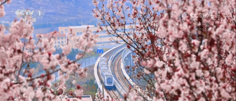 每年三月底至四月初,山东青岛的蓝谷快线北宅至庙石段两侧的山坡上,绵延数里的樱桃花海绚烂绽放,市民游客在乘车过程中便可邂逅山风海韵、花海浪漫。