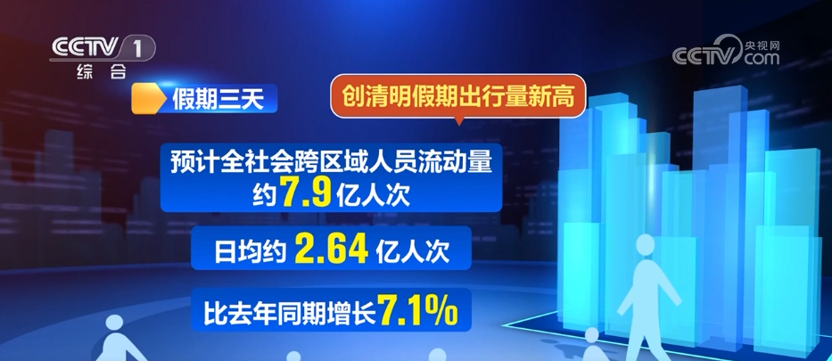 来自交通运输部的最新数据显示,假期三天,预计全社会跨区域人员流动量约7.9亿人次,日均约2.64亿人次,比去年同期增长7.1%,创清明假期出行量新高。假期第一天,全国铁路旅客发送量达2009.3万人次,创今年以来单日旅客发送量新高。