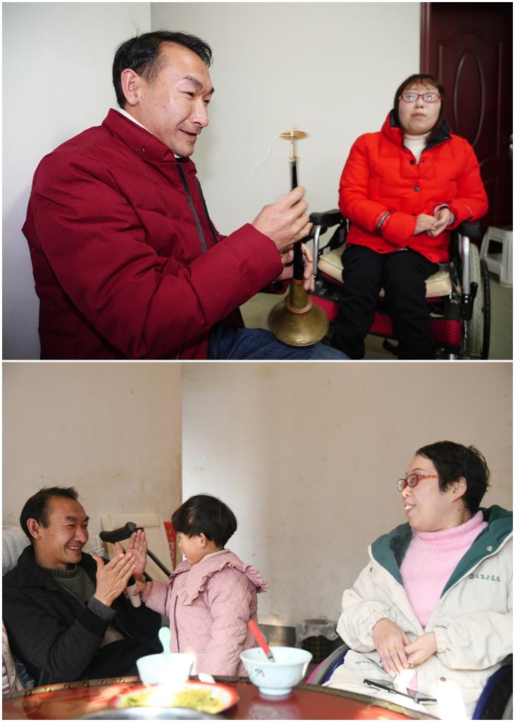 这是一张拼版照片,上图为:2019年1月6日,牟文贵(左)在家为妻子吹奏唢呐(新华社记者邵瑞摄);下图为:2024年12月29日,牟文贵(左一)在家与女儿玩耍(新华社记者张博文摄)。