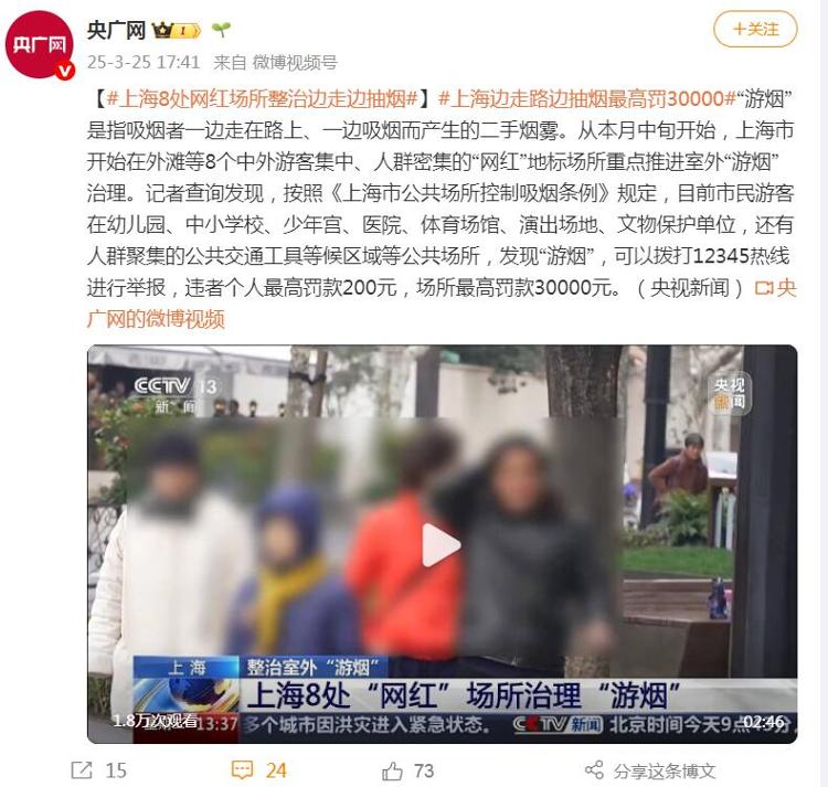 基于这一事实基础,这次全网热议的“控烟令”则是做到了从内到外升级,主要是针对中外游客集中、人群密集的“网红”地标场所,将多举措重点推进“游烟”治理。这一创新实践,再次展现了上海在公共健康治理领域的创新魄力。这一实践不仅是对城市精细化管理的积极探索,更为全国控烟工作提供了可复制、可推广的“上海方案”。