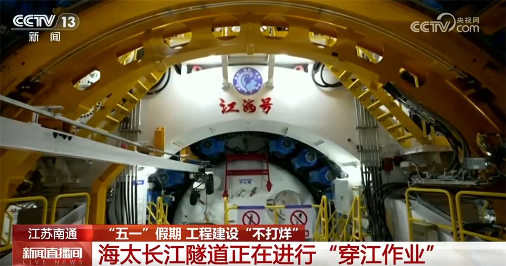 记者现在所处的位置是江苏南通海门区境内,位于长江江底之下,距离地面有30多米深。这个“五一”,有300多名工人持续奋战在隧道施工一线,全力确保施工进度安全有序推进。在记者现在的这个点位,并没有很多施工人员。其实,这里掘进主要是靠这台“江海号”盾构机。它于今年4月9日正式开启穿江作业,经过20多天的推进,现在已掘进到200米,目前以每天10米的速度稳步向前推进。现场,我们还能听到盾构机掘进发出的轰鸣声。