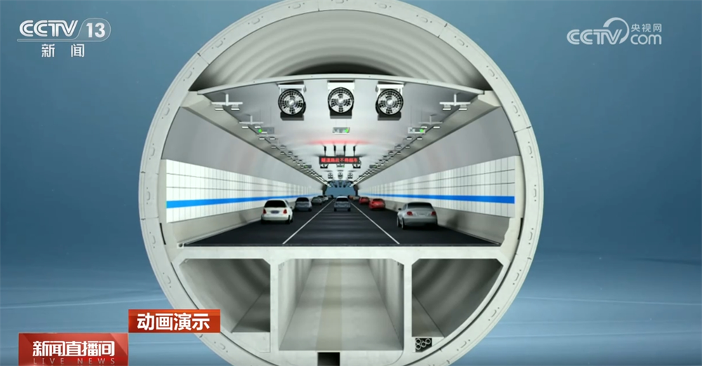 接下来,我们来看这张图,这是隧道建设完成后的横截面示意图。隧道整体分为上、中、下三个部分,最上面是烟道层,中间是行车道,下面依次是管线廊道、疏散通道以及逃生楼梯间。也就是说,如果在隧道中间发生安全事故,人员可以迅速通过逃生楼梯间到达下层的疏散区域,乘坐救援车辆快速撤离隧道。这是国内首创的救援车专门通道设计。据工作人员介绍,海太长江隧道采用双向六车道设计标准,设计时速为100公里,预计在2028年基本建成。建成后,车辆过江仅需10分钟,从海门这里出发,半个多小时就能到达上海市中心。可以说,海太长江隧道的建设对于贯彻落实长三角区域一体化发展、推动长江两岸城市群的跨江融合发展等,都具有十分重要的意义。