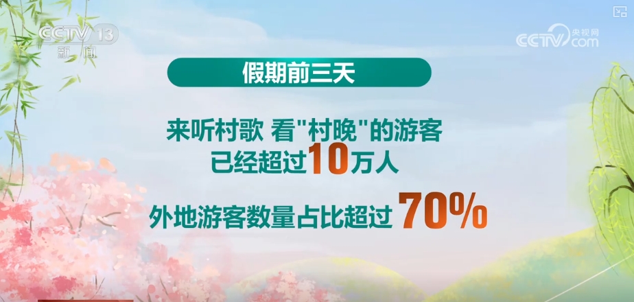 这些表演队员都是附近村里的村民,他们闲暇时候自己编写的村歌,让这里也成了全国“四季村晚”的举办地。爱好“村歌”的粉丝“朋友圈”也逐渐扩大,数据显示,假期前三天,来听村歌、看“村晚”的游客已经超过10万人,而外地游客数量的占比超过70%。