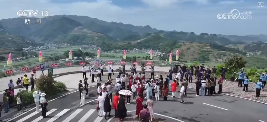 在贵州省遵义市官仓镇,假期里一辆辆大巴车沿着蜿蜒的盘山公路一路前行。游客们刚下车,立刻就被汹涌而来的“歌声浪潮”所席卷,游客们也不自觉地加入其中,现场氛围感十足。