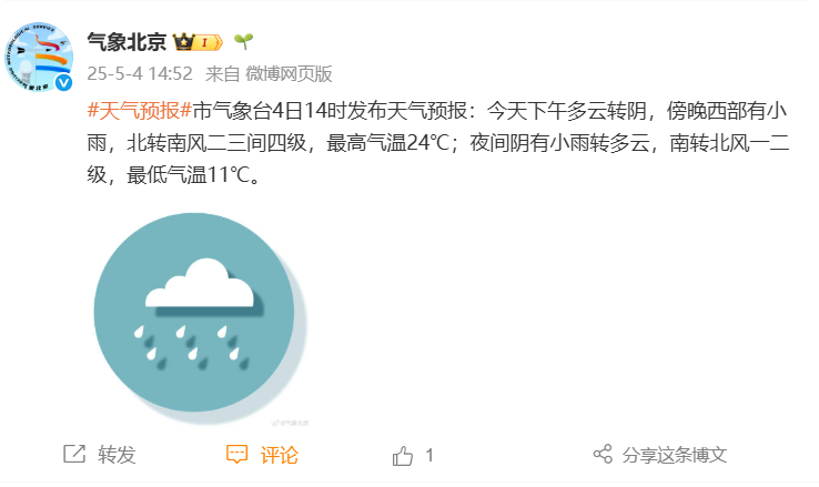 CCTV Haberleri: Pekin Meteoroloji Gözlemevi, 4.'de 14: 00'da bir hava tahmini yayınladı: Bu öğleden sonra bulutlu olacak ve akşamları batıda hafif yağmurlu bulutlu olacak. Kuzey güneye ve güney rüzgarları seviye 2,3 ve 4'e döner ve en yüksek sıcaklık 24 ℃'dir; Geceleri bulutlu olacak. Hafif yağmur, güney ve kuzey rüzgarları 1,2 seviyesine ve en düşük sıcaklık 11 ℃ 'dır.