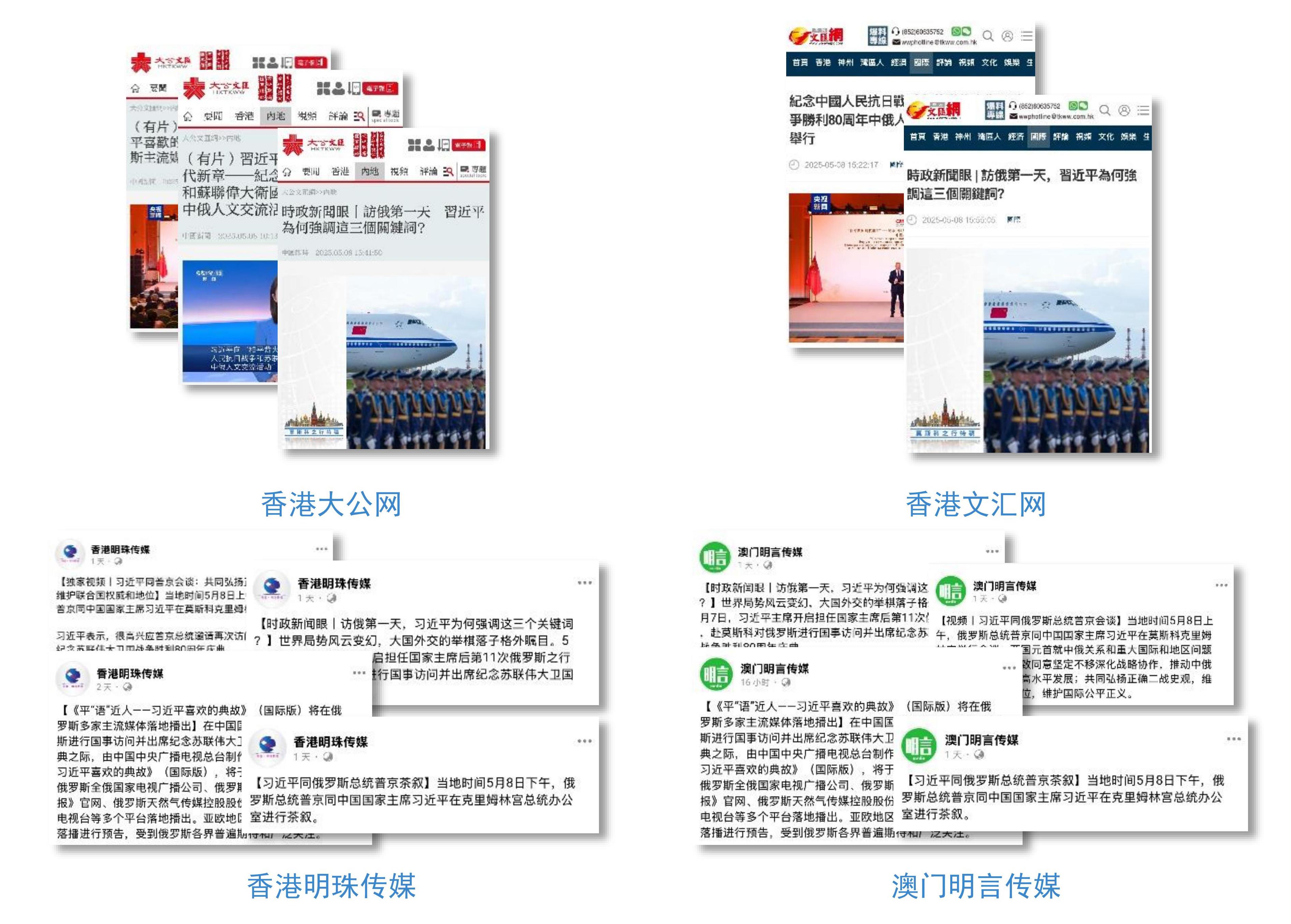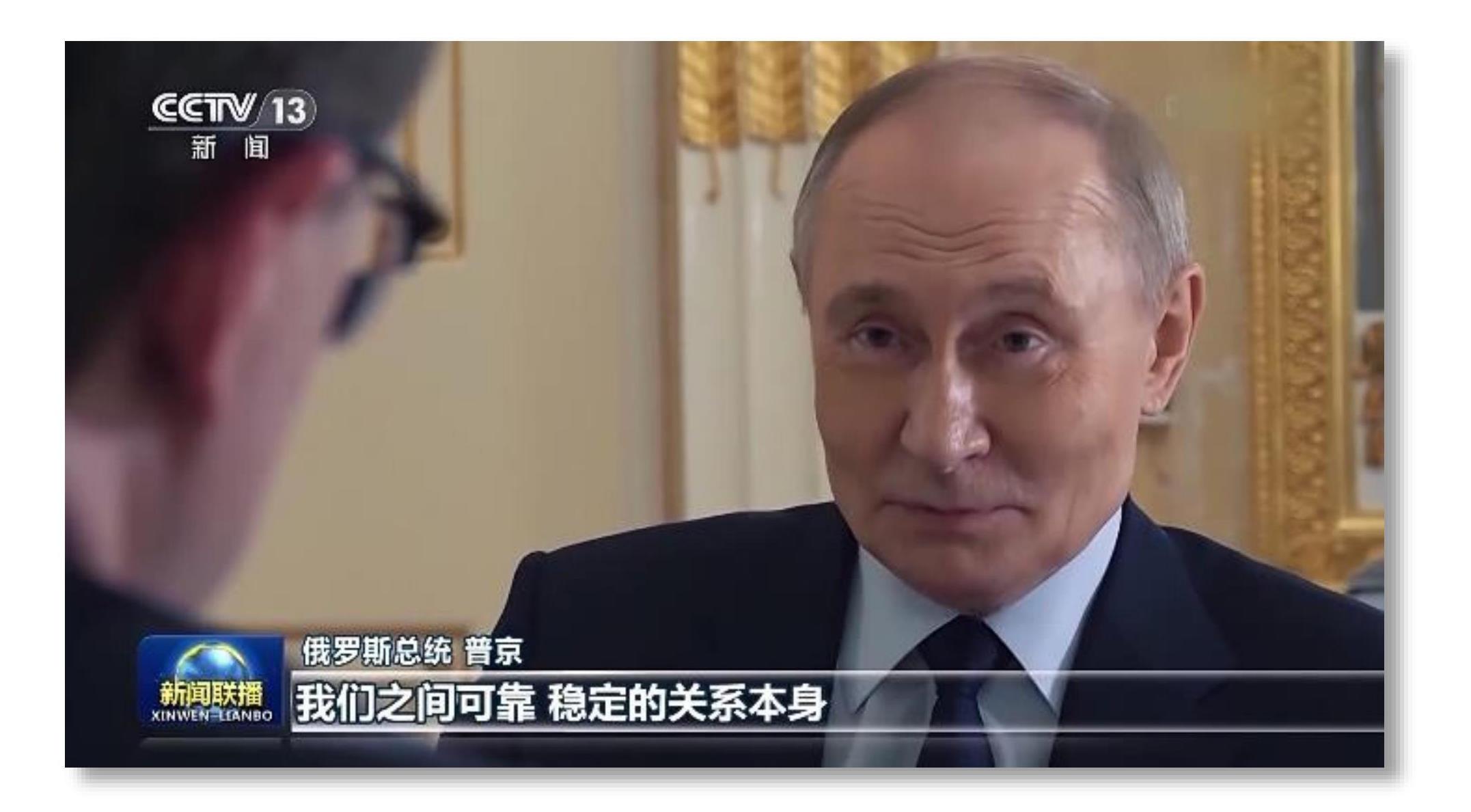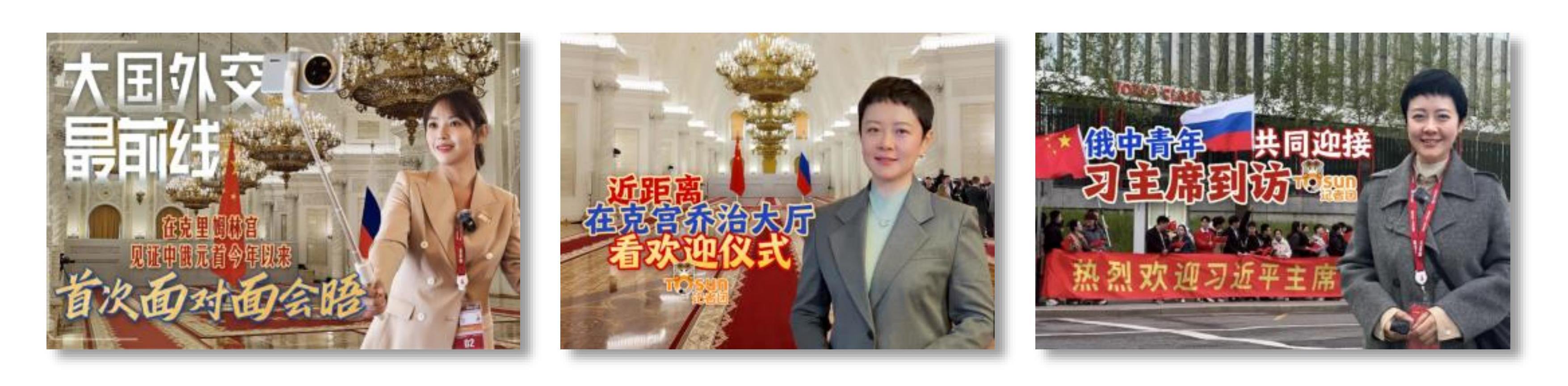 深厚情谊,感人!《习近平同普京会谈:共同弘扬正确二战史观 维护联合国权威和地位》《习近平同普京在主观礼台出席红场阅兵式》《在克里姆林宫,见证中俄元首今年以来首次面对面会晤》等报道,突出习主席和普京总统亲切互动的经典瞬间、丰富细节,展现两国元首高度互信、友谊深厚,引领中俄关系登高望远、坚毅前行。《近距离在克宫乔治大厅看欢迎仪式》《俄中青年共同迎接习主席到访》等视频产品,凸显当地民众隆重迎接习主席到访的热烈氛围。