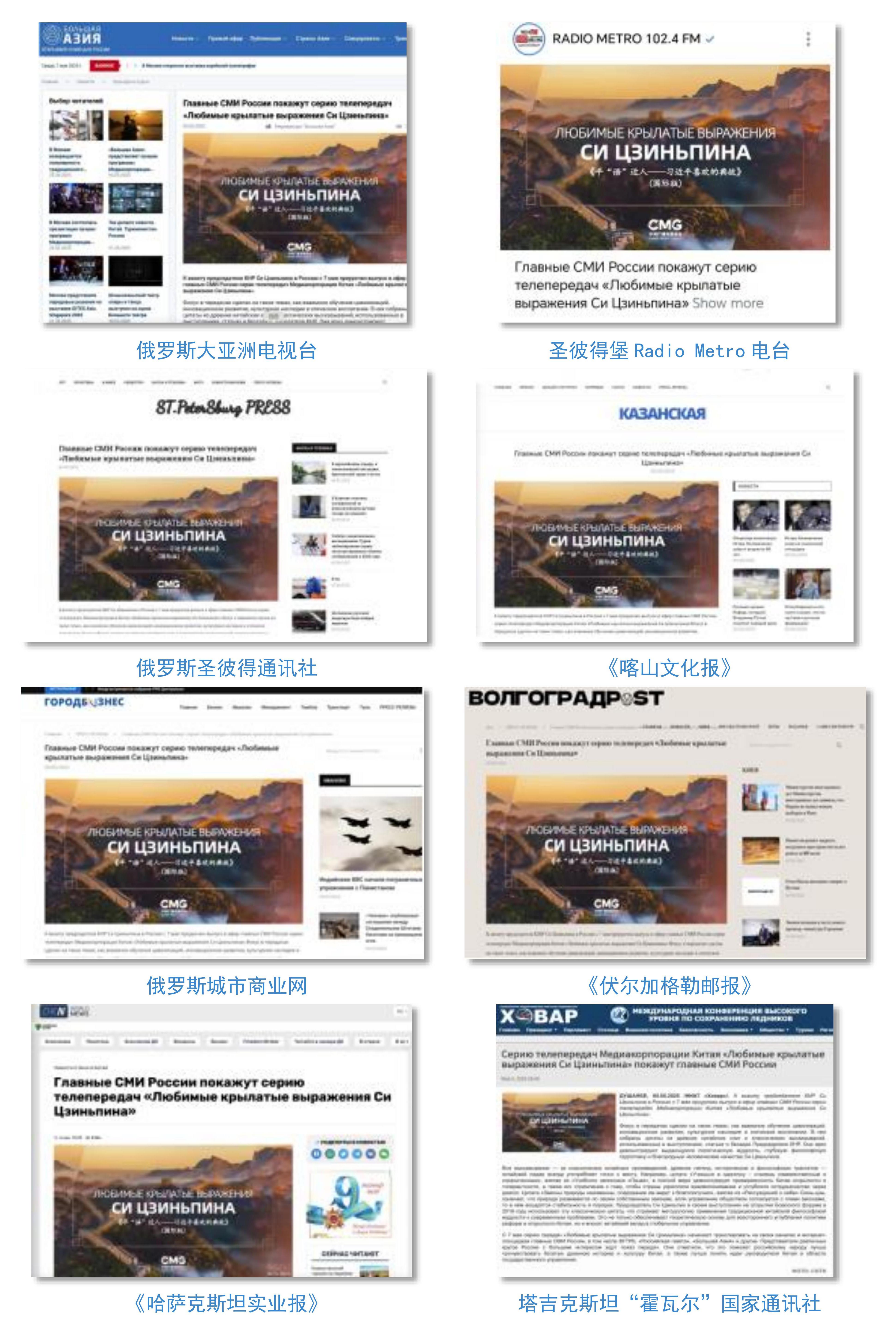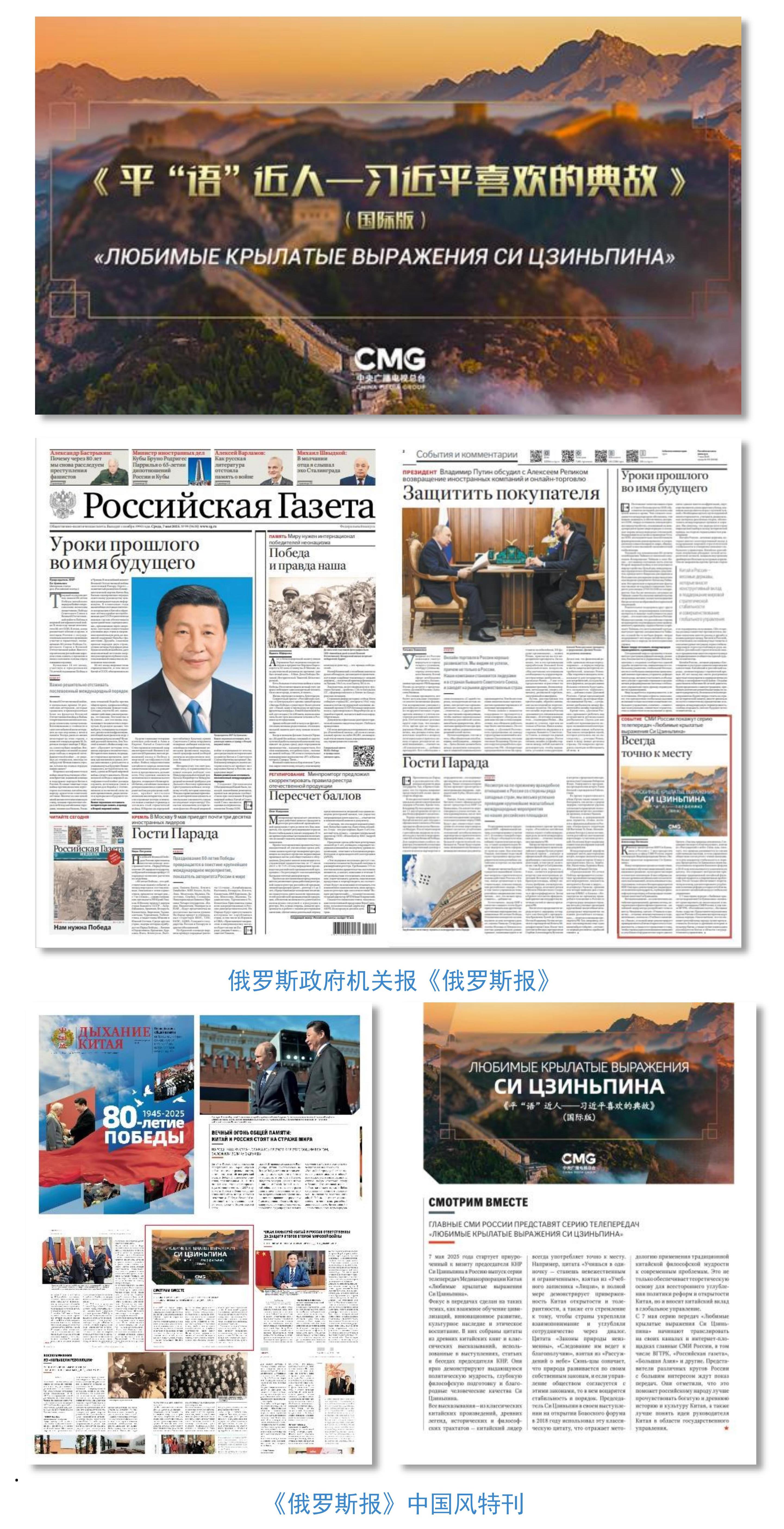 播撒人文之光。此访期间,《平“语”近人——习近平喜欢的典故》(国际版)在俄罗斯全俄国家电视广播公司、俄罗斯政府机关报《俄罗斯报》官网、俄罗斯天然气传媒控股股份公司、俄罗斯大亚洲电视台等多平台播出。《俄罗斯报》、俄罗斯大亚洲电视台、圣彼得堡Radio Metro电台、俄罗斯圣彼得通讯社、《喀山文化报》《哈萨克斯坦实业报》、塔吉克斯坦“霍瓦尔”国家通讯社等亚欧地区多家主流媒体对节目进行报道。《习近平的文化情缘》《解码中国:独特的现代化之路》等十余部总台精品节目也在俄罗斯主流媒体陆续播出。