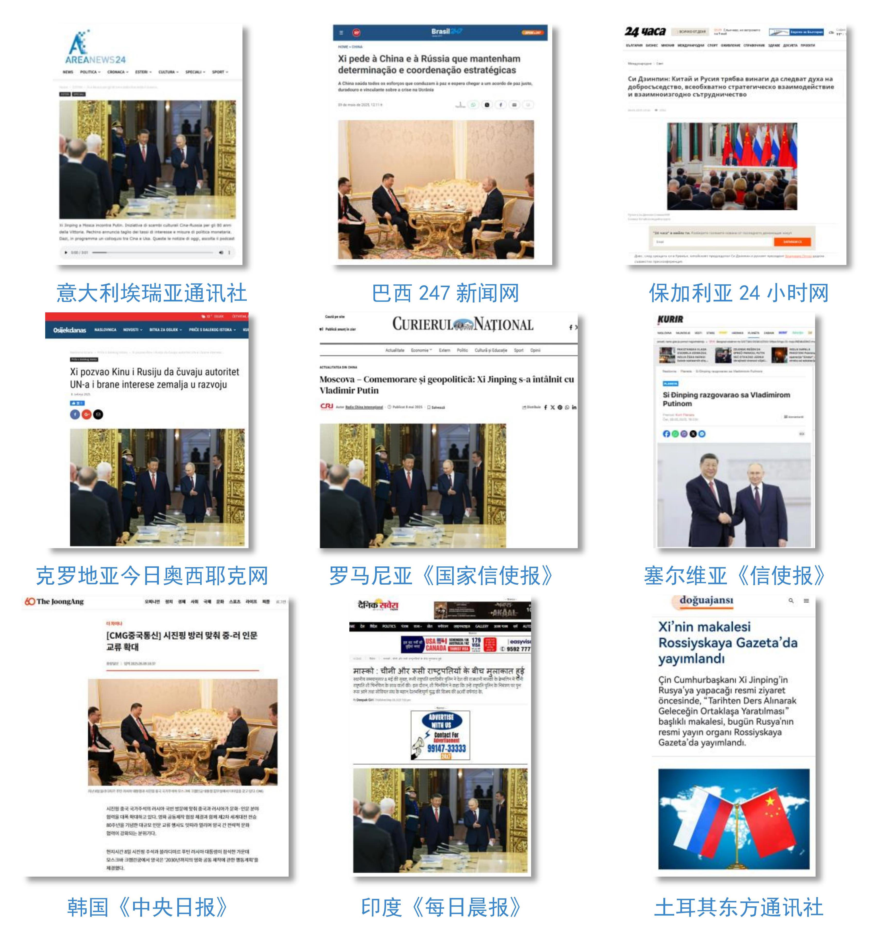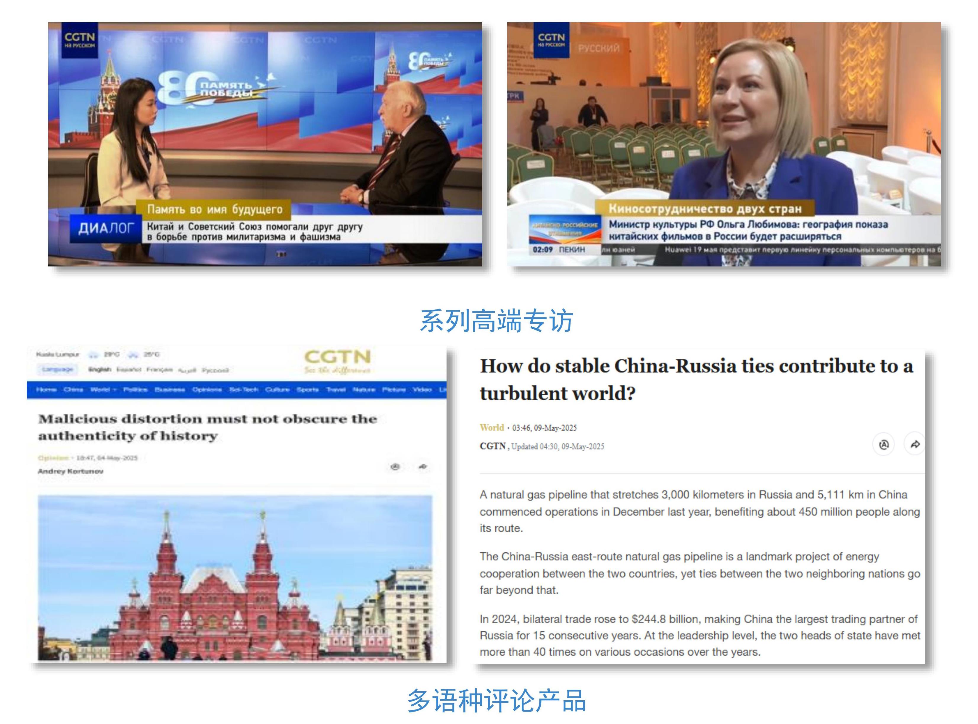 全球治理展现担当。CGTN高端专访《胜利日回声》等广泛采访85位国际政要、海外人士,展现国际社会高度评价习主席此访,普遍认同中国以实际行动为动荡变革的世界注入宝贵的确定性。总台多语种记者在BBC、RT等50家海外媒体主动发声,多语种平台推出《挺膺担当,中俄并肩对世界负起“特殊责任”》《稳定的中俄关系为动荡世界注入确定性与正能量》《维护多极格局 共享发展机遇》等评论文章,阐述中俄两国牢牢把握双边关系前进方向和人类社会发展大势,挺膺担当、全面协作,携手为人类前途命运争取更加光明的未来。