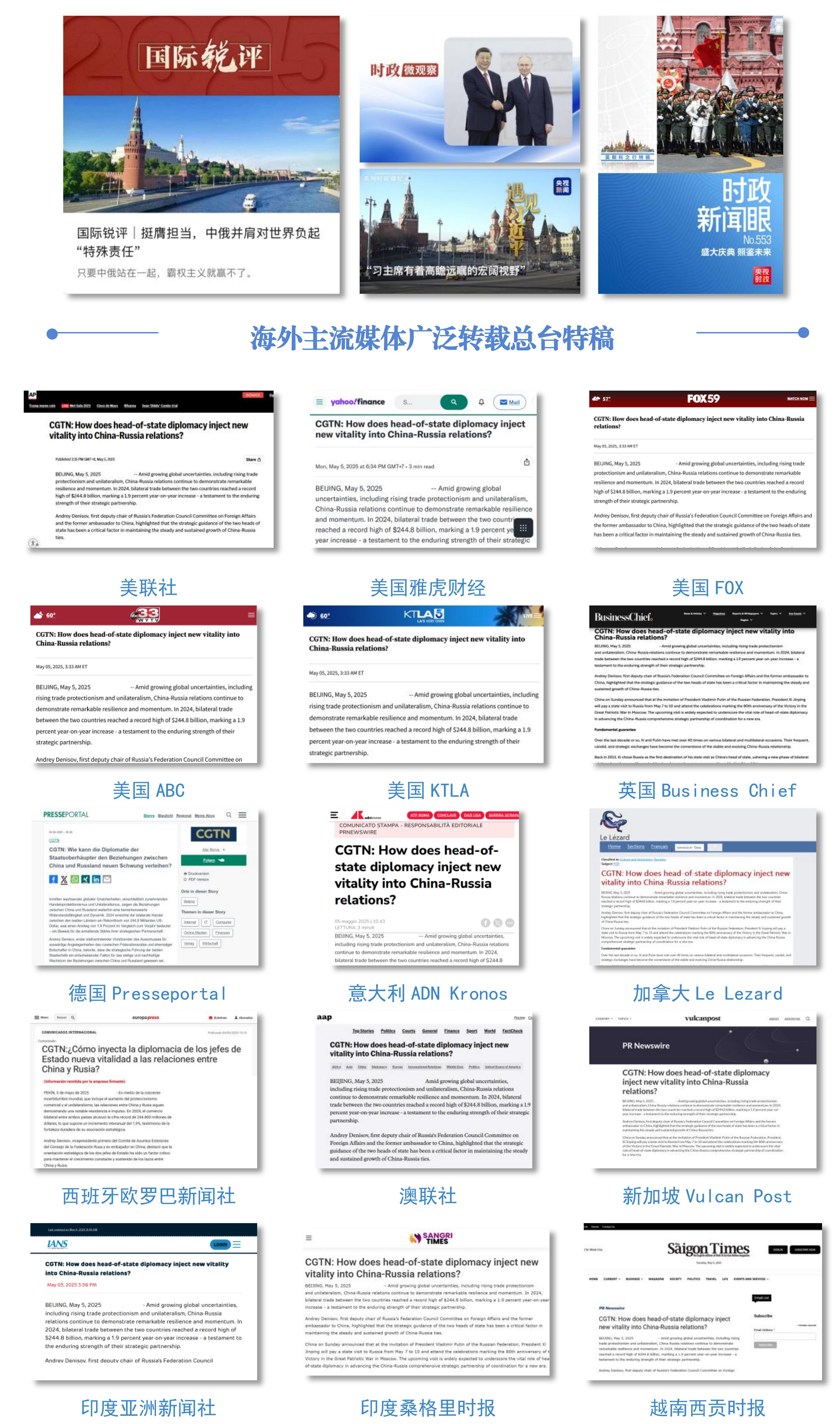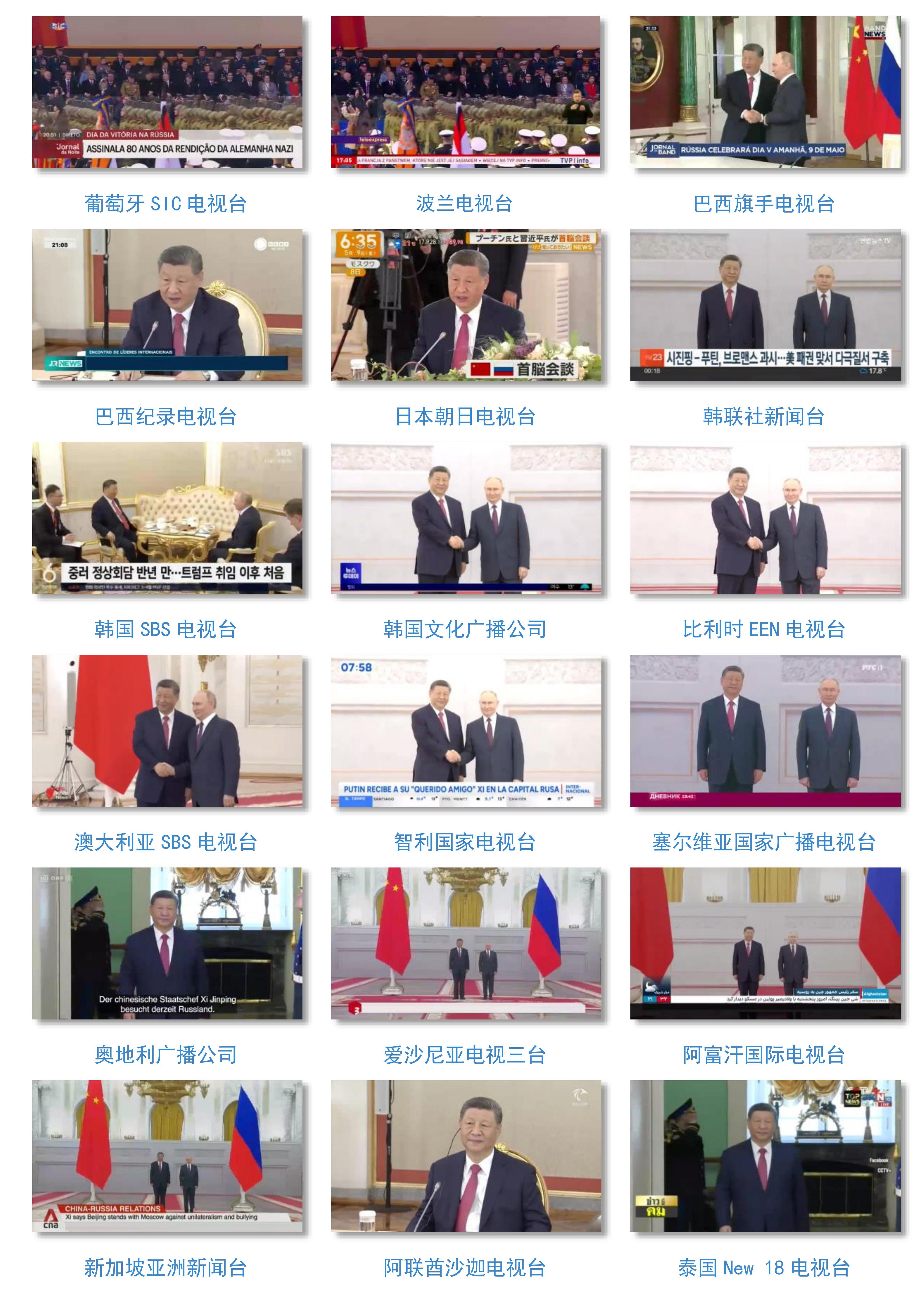 全景报道。新闻频道、中文国际频道、中国之声、环球资讯广播、大湾区之声等滚动播发新闻,推出《习近平对俄罗斯进行国事访问》《习主席外交时刻》等专题专栏、系列节目。CGTN充分发挥82种语言融合传播优势,发布《元首外交为中俄关系注入新活力》《中俄新机遇》等多语种报道3800余条,同步向全球传递此访重要动态。