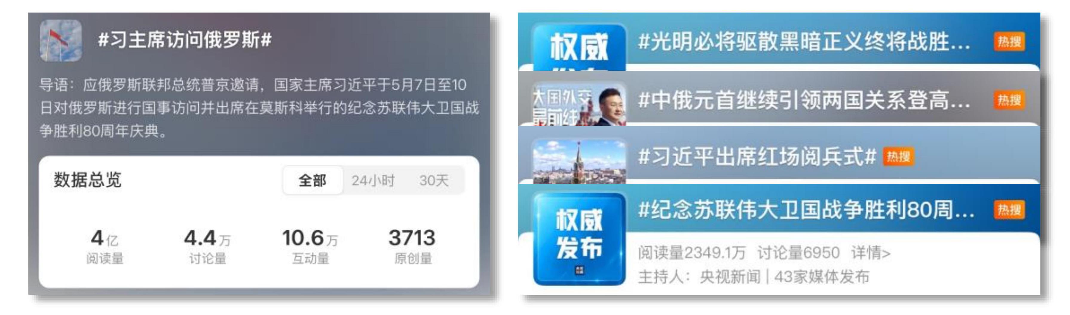 全网热议。央视新闻发起的#习主席访问俄罗斯#、#习近平出席红场阅兵式#、#中俄元首继续引领两国关系登高望远#、#共同弘扬正确二战史观#等45个微博话题登上热搜,阅读量超9.4亿。