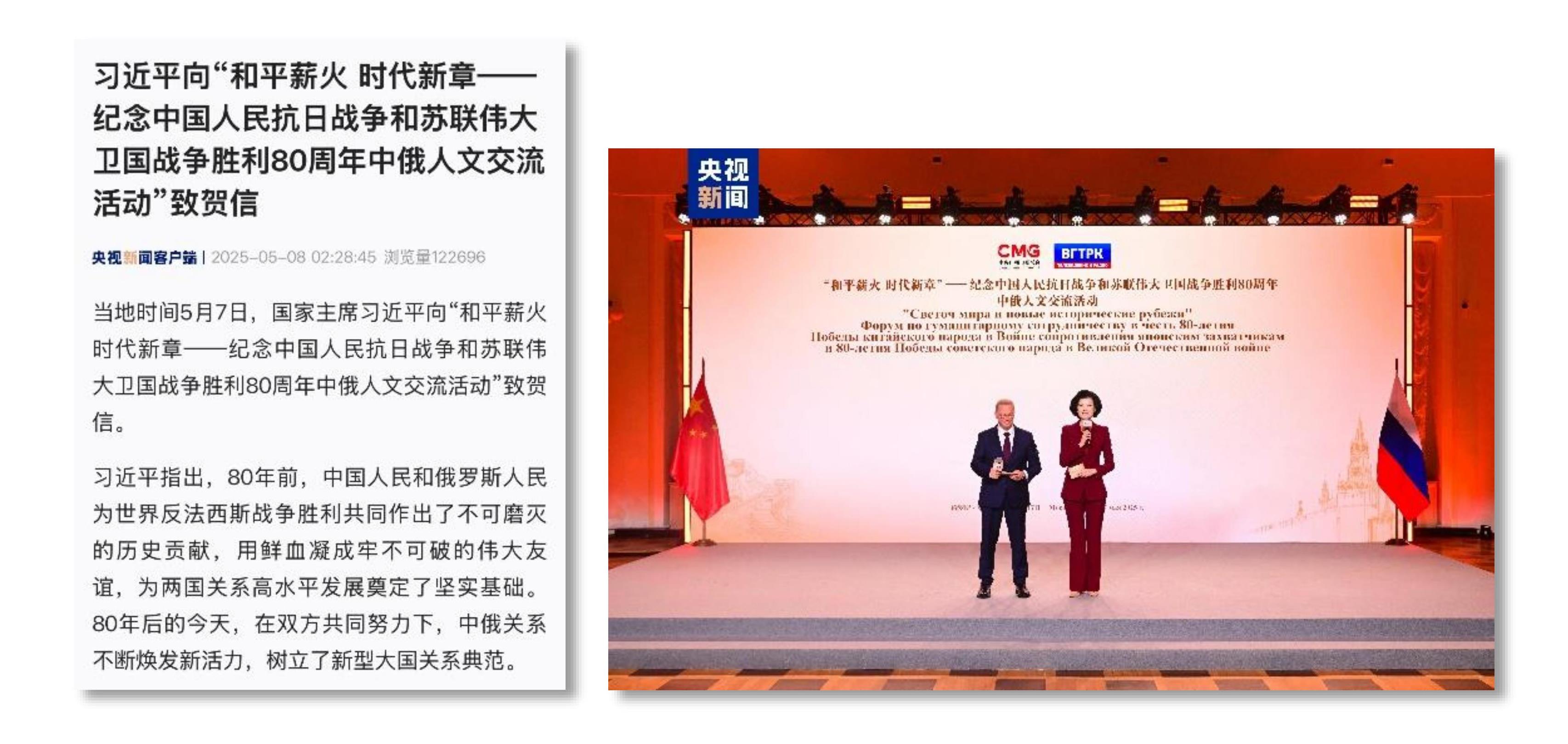 促进交流交融。此访之际,由总台和俄罗斯全俄国家电视广播公司联合主办的“和平薪火 时代新章——纪念中国人民抗日战争和苏联伟大卫国战争胜利80周年中俄人文交流活动”在莫斯科举行。习近平主席和普京总统向活动致贺信。活动现场推介了中俄合拍电影《红丝绸》,启动了2025年俄罗斯“中国电影节”“和平的印记”主题融媒体活动等,中俄合拍纪录片《伟大的胜利——苏联摄影师镜头里的中国抗战》同日开机。