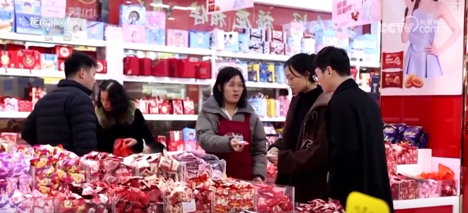 除了蛇元素的新春装饰品热销,礼盒、干货、坚果炒货等传统年货,各式各样的休闲零食也人气满满。年宵花迎新年