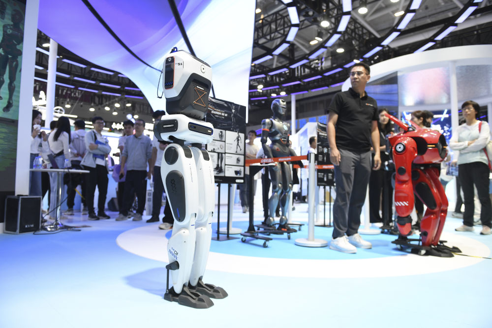 在深圳举行的第二十六届中国国际高新技术成果交易会上,深圳市众擎机器人科技有限公司展示双足机器人SA01的行走能力(2024年11月14日摄)。 新华社记者 毛思倩 摄