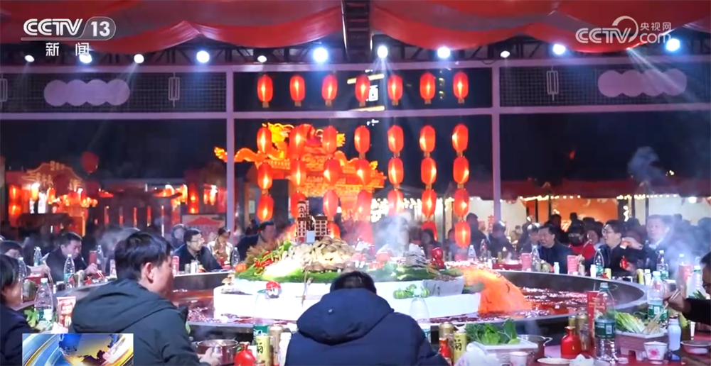 When night falls, in the square in front of the People's Cultural Palace in Chongqing, the lights are bright. Herkes 1.000 metrekarelik güveç ziyafeti salonuna girer ve soğuk kışın sıcak tencerenin getirdiği sıcaklık ve neşeli atmosferi hisseder.