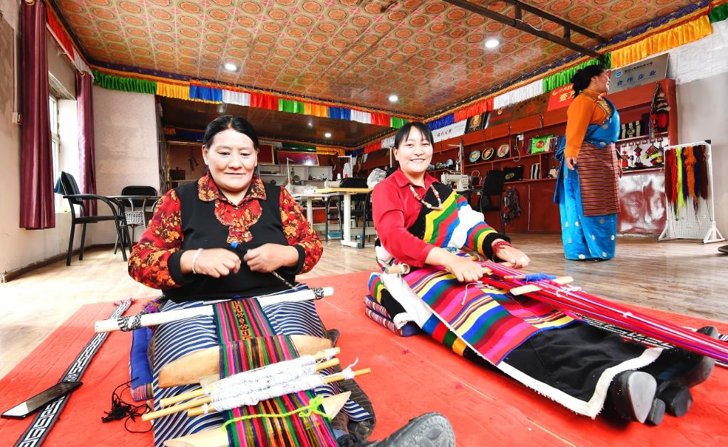 2024年6月11日,村民在长江源村岗巴布民族手工艺品加工专业合作社加工氆氇。新华社发(冯春梓摄)