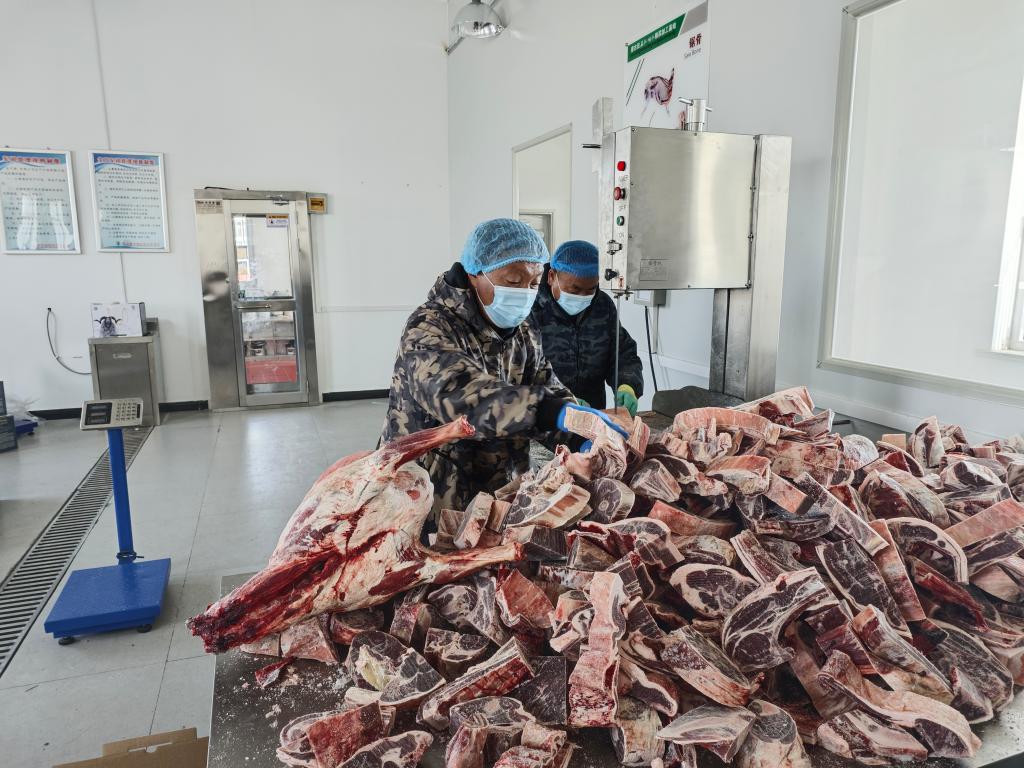2024年1月23日,长江源村村民在村内精深加工基地加工牦牛肉。新华社发(梁亮摄)