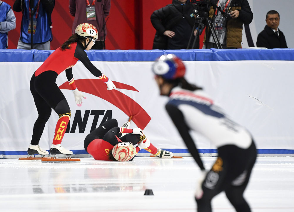 2024年12月7日,中国队选手王晔(中)在2024-2025赛季国际滑联短道速滑世界巡回赛北京站女子3000米接力A组决赛中受伤。新华社记者 鞠焕宗 摄