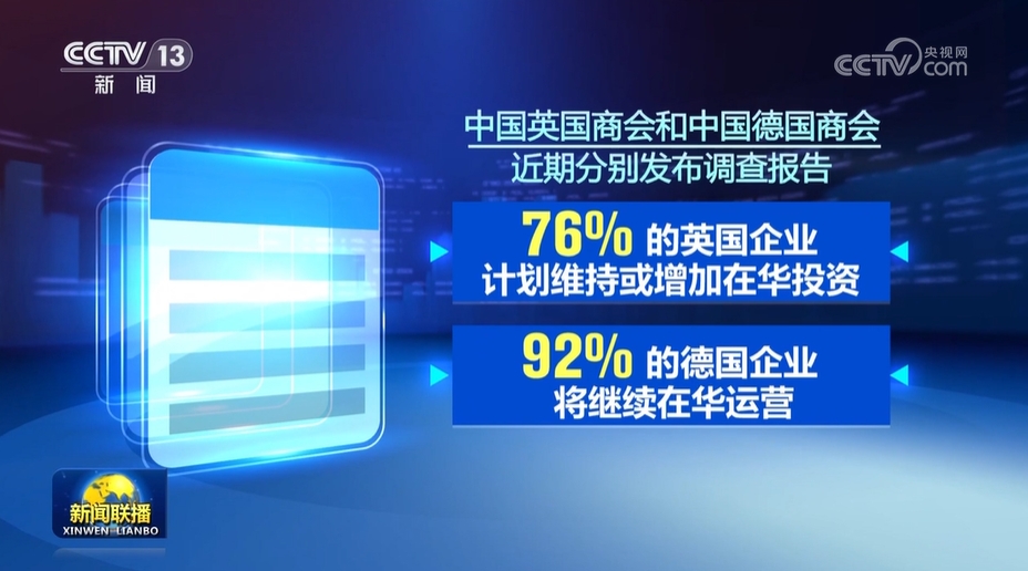 İngiliz Ticaret Odası ve Çin Çin Ticaret Odası yakın zamanda anket raporları yayınladı, İngiliz şirketlerinin% 76'sı Çin'deki yatırımı sürdürmeyi veya artırmayı planlıyor, Alman şirketlerinin% 92'si Çin'de faaliyet göstermeye devam edecek ve önümüzdeki iki yıl içinde yatırımı artıracak.