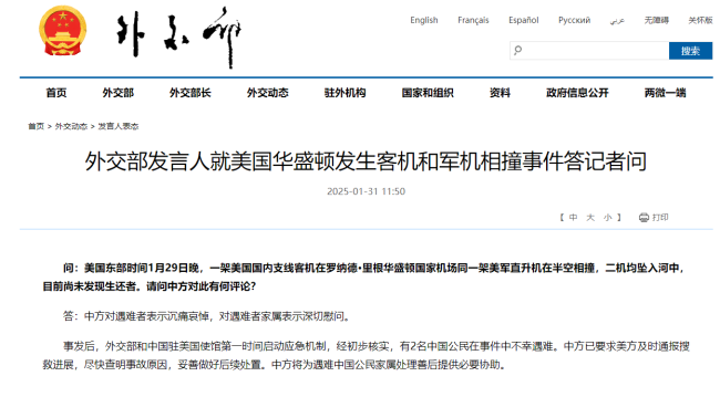 q: 29 Ocak akşamı, Doğu saati, yerli bir ABD bölgesel yol uçağı Ronald Reagan Washington Ulusal Havaalanı'nda orta havada çarpıştı. Her iki uçak da nehre düştü ve henüz hayatta kalanlar bulunmadı. Çin’in bu konudaki yorumu nedir?