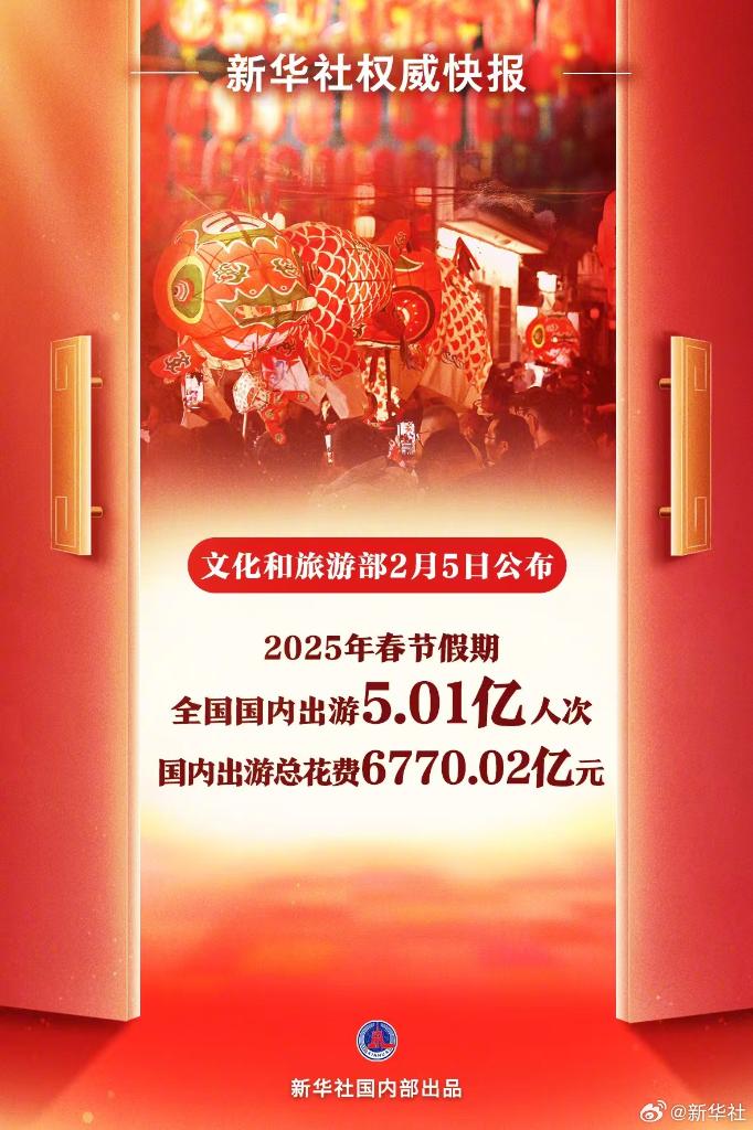 2月5日,文化和旅遊部公佈春節假期最新數據:春節假期8天,全國國內出遊5.01億人次,同比增長5.9%;國內出遊總花費6770.02億元,同比增長7.0%。全國出遊人次和總花費再創新高!