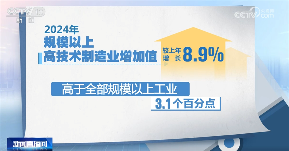 透過這份答卷,可以看到製造業高端化、智能化、綠色化趨勢不斷顯現,以電子汽車、鐵路、船舶、航空航天等為代表的高端製造業,都保持了良好發展態勢。 2024年,規模以上高技術製造業增加值較上年增長8.9%,高於全部規模以上工業3.1個百分點。