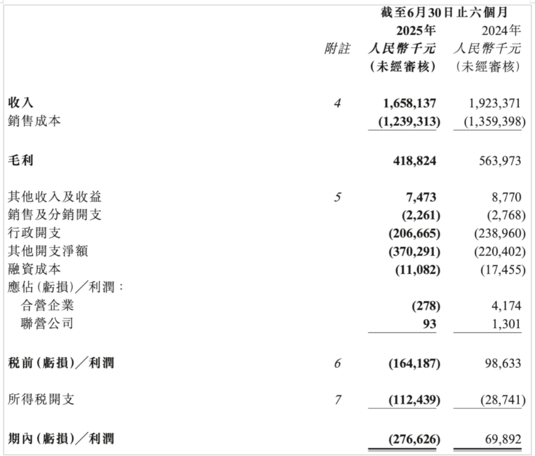 财报数据显示,今年上半年,合景悠活实现营收约16.58亿元,同比下降13.8%;期内录得毛利约4.19亿元,同比减少25.7%;更为惨烈的是净利润,亏损约2.77亿元,而上年同期的净利润约为6989.2万元。