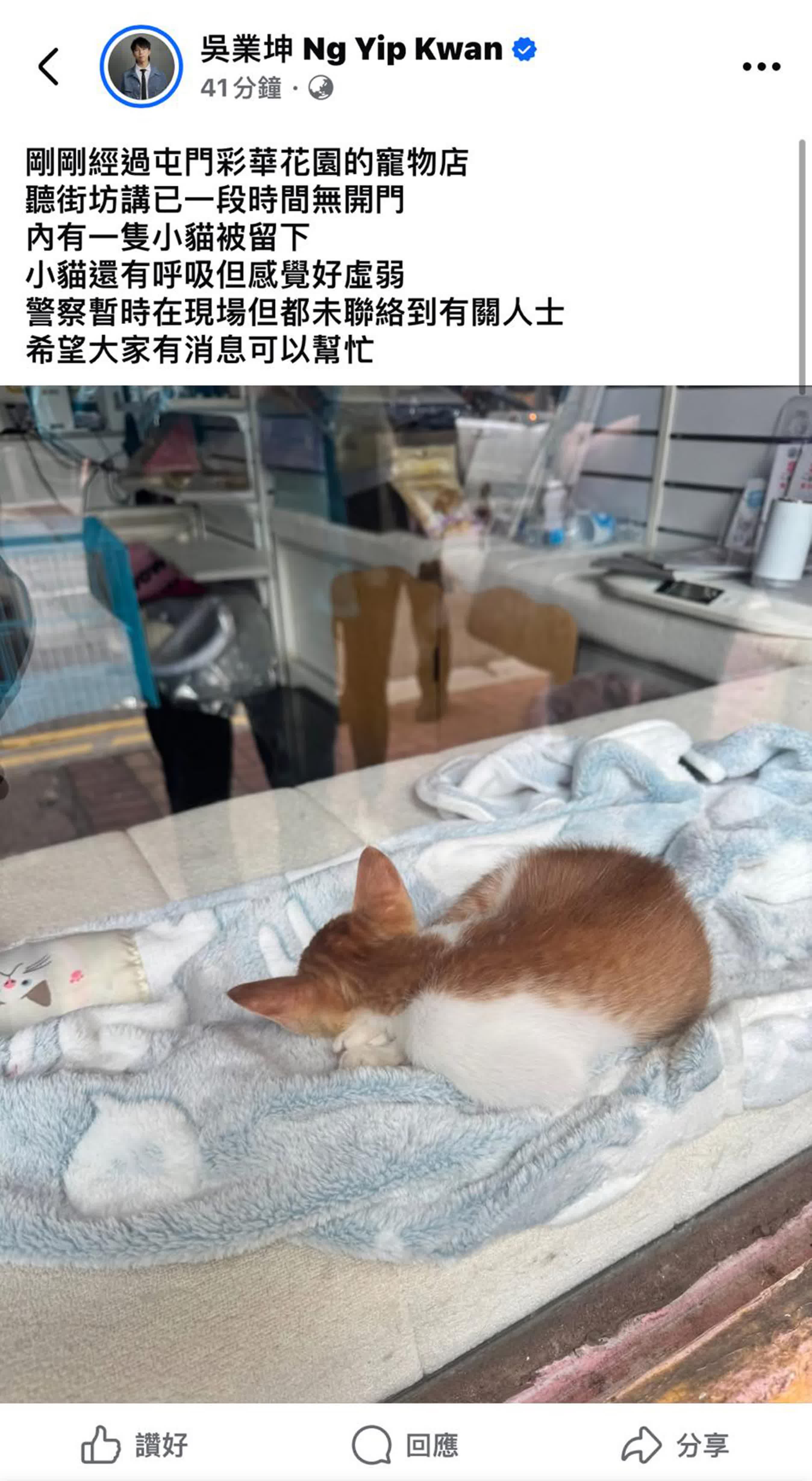 藝人吳業坤就事件曾於facebook發文,指今日下午3時左右經過上址時,見到該寵物美容店已有街坊及警員「圍住」,又指「小貓還有呼吸但感覺好虛弱,警察暫時在現場但未能聯絡到有關人士」。其後又更新指「警察已連絡到店主」,指報警的人士是因為下午2點約了狗狗洗澡,而店主沒有出現才選擇報警,直至到下午4時半左右才聯絡到當事人,「後續再得當事人落完口供再了解」